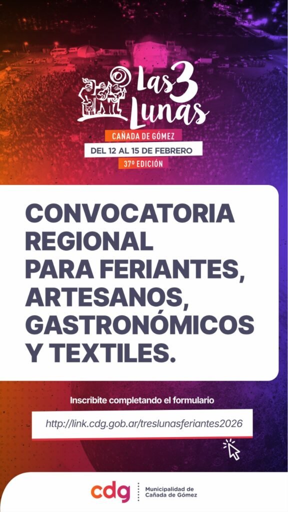 Desde el municipio se informa que ya se encuentra abierta la convocatoria regional para participar como feriante en la edición N.º 37 del tradicional festival Las Tres Lunas, que se realizará del 12 al 15 de febrero de 2026 en el Polideportivo Víctor y Agulino Carbonari.