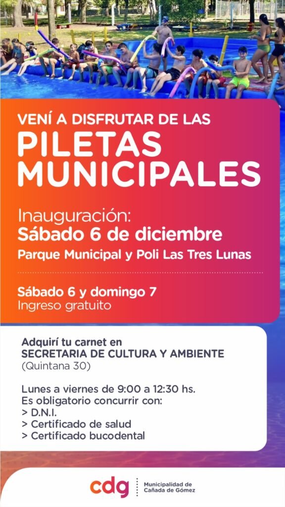 La Municipalidad de Cañada de Gómez anuncia la inauguración de la temporada 2025/2026 de los natatorios municipales, que se llevará a cabo el sábado 6 de diciembre en el Parque Municipal y el Polideportivo “Las Tres Lunas”.