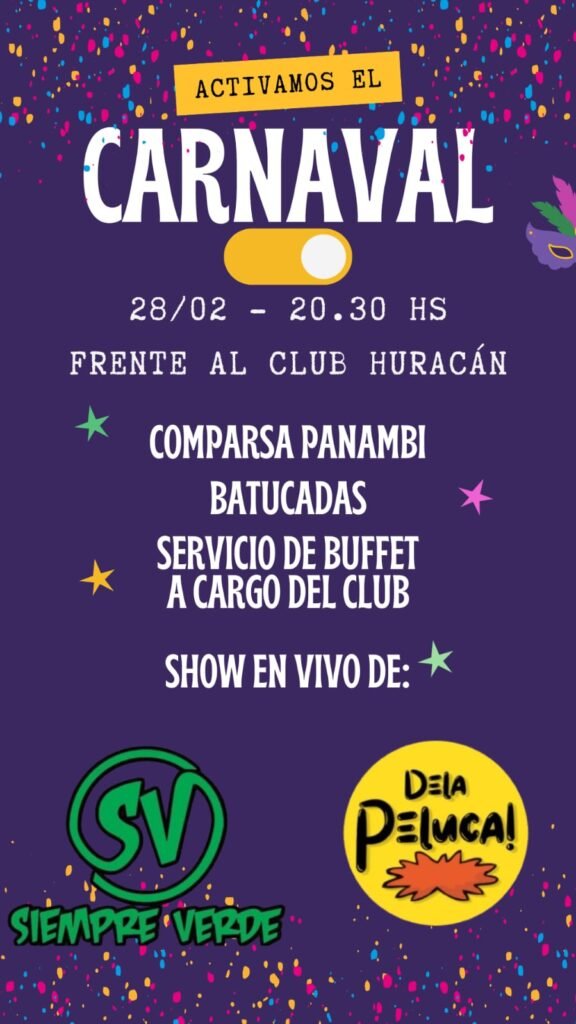 El Club Huracán de Bustinza será escenario de los carnavales el sábado 28 a partir de las 20:30 hs, con una propuesta que incluirá comparsas y espectáculos musicales en vivo.