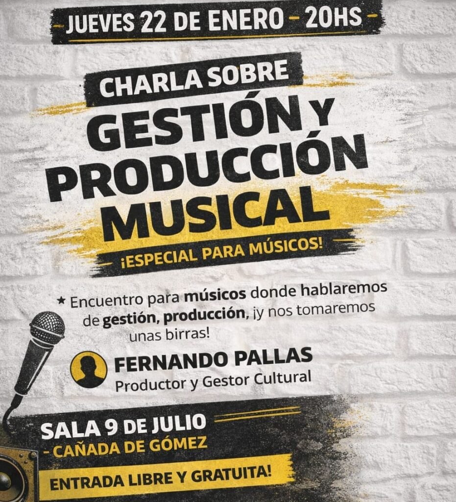 El jueves 22 de enero a las 20, la Sala 9 de Julio de Cañada de Gómez albergará una charla abierta sobre producción y gestión musical, orientada a músicos, artistas y personas vinculadas al ámbito cultural.