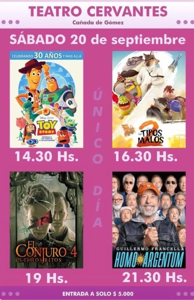 El sábado 20 el Cervantes ofrece cuatro funciones de películas para público variado; a las 14:30 hs se comienza la función con el remake de Toy Story en su 30° aniversario, a las 16:30 hs película animada Los Tipos Malos, 19 hs El Conjuro 4 y la última función a las 21:30 hs Homo Argentum, protagonizada por Guillermo Francella.