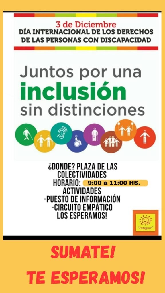 En el marco del Día Internacional de los Derechos de las Personas con Discapacidad, el Centro de Día Integrar llevará adelante una jornada de concientización y visibilización en la Plaza de las Colectividades, el miércoles 3 de9 a 11.