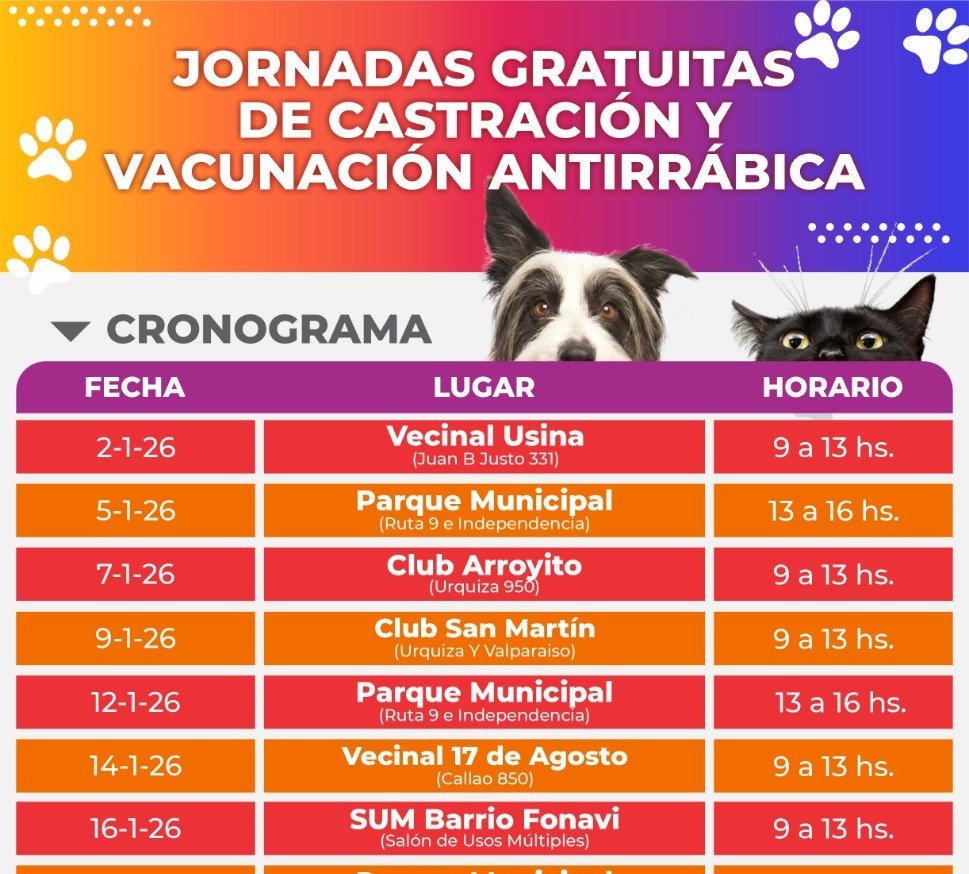 El municipio informa el cronograma de castraciones, vacunación antirrábica y atención veterinaria primaria para el mes de enero, como parte del Programa de Equilibrio Poblacional que lleva adelante el Área de Salud Animal: