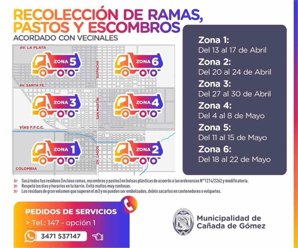 La Municipalidad de Cañada de Gómez informa el cronograma de recolección de ramas, pastos y escombros para las próximas semanas: