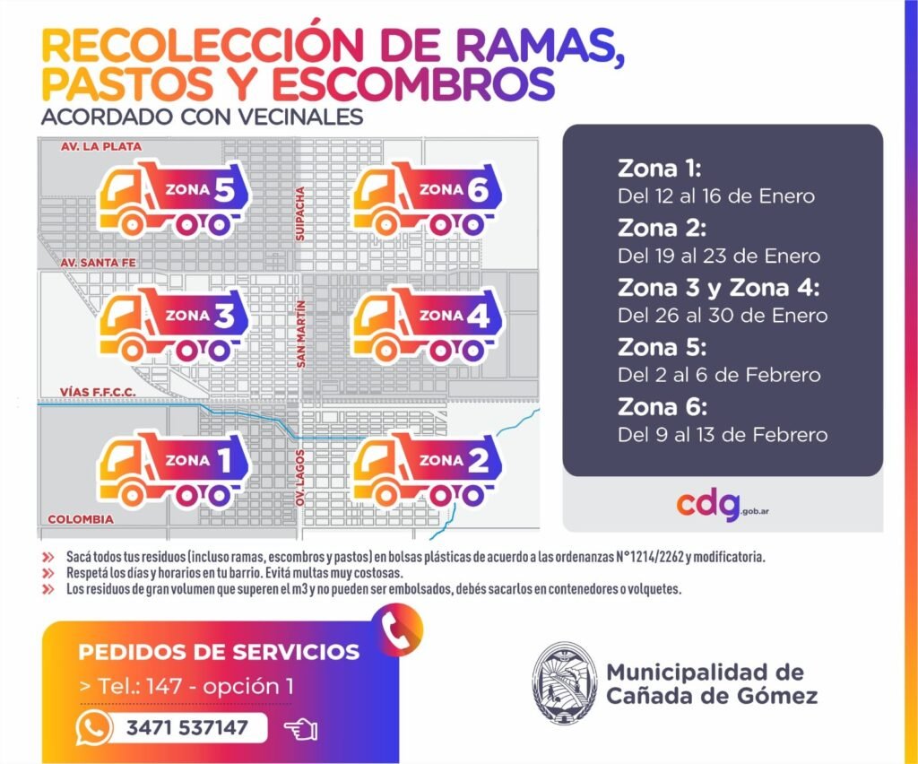 La Municipalidad de Cañada de Gómez informa el cronograma de recolección de ramas, pastos y escombros para las próximas semanas: