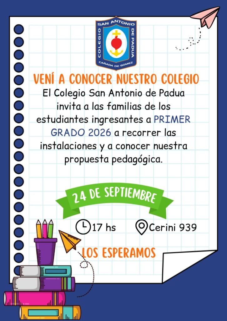 Desde el Colegio San Antonio de Padua invitan a familiares y estudiantes ingresantes de primer grado 2026 a recorrer sus instalaciones y descubrir las propuestas educativas y pedagógica que tienen para ofrecerles.