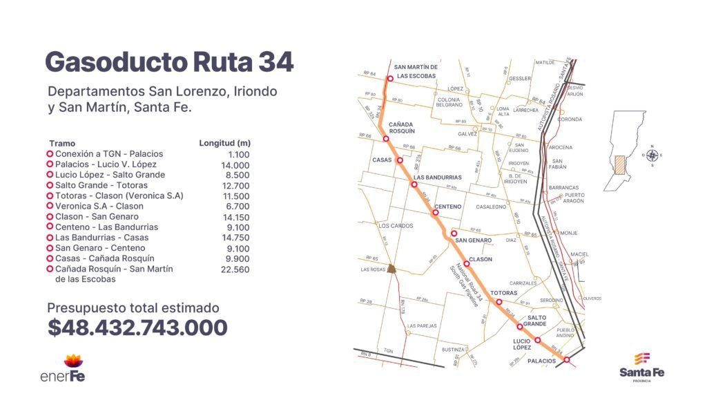 Los insumos recibidos corresponden a la ejecución de la primera etapa del Gasoducto Regional de la Ruta 34, un tramo estratégico que conectará la localidad de Luis Palacios con Lucio V. López. Esta obra es el eslabón inicial de un proyecto de gran envergadura diseñado para extenderse progresivamente hacia el norte, con el objetivo técnico de abastecer en sus etapas futuras a Salto Grande, Totoras, Clason, San Genaro, Centeno, Las Bandurrias, Casas, Cañada Rosquín, hasta llegar a San Martín de las Escobas.