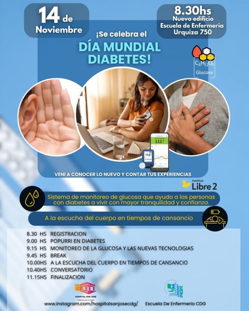 En el marco del Día Mundial de la Diabetes, el Hospital San José junto a la Escuela de Enfermería organizan una jornada destinada a profesionales de la salud. La actividad se realizará el jueves 14 de noviembre desde las 8.30 hs, en el nuevo edificio de la Escuela de Enfermería, ubicado en Urquiza al 750.