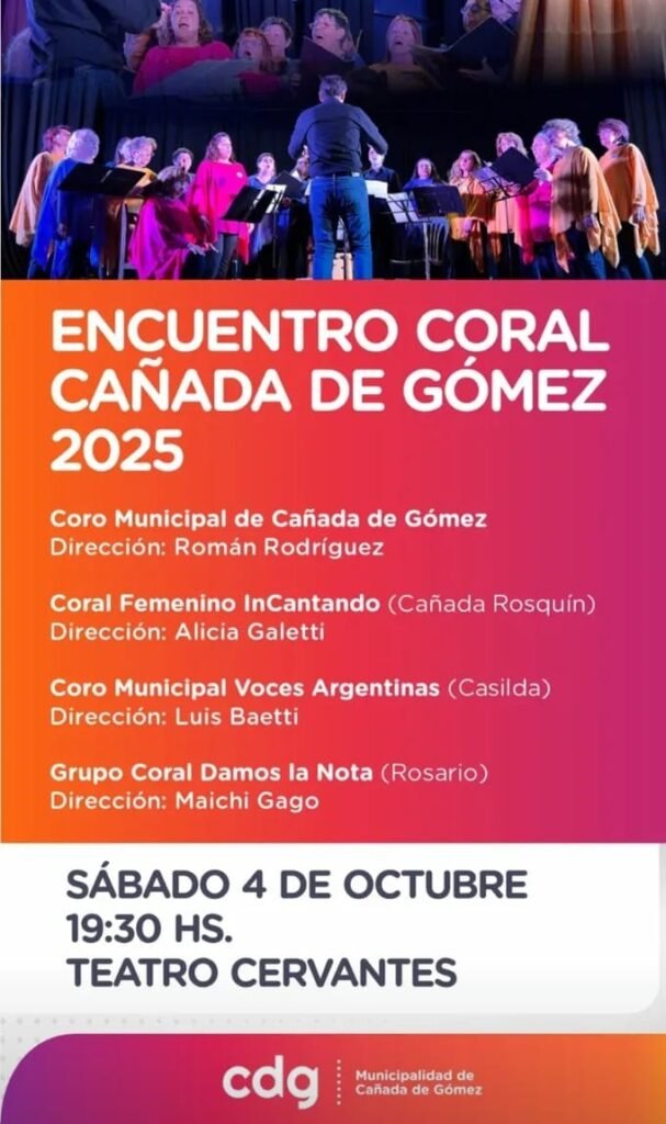 El sábado 4 a partir de las 19:30 hs en el Teatro Cervantes se podrá disfrutar de un Encuentro Coral en nuestra ciudad, donde participaran Coros de Cañada Rosquín, Casilda y Rosario.