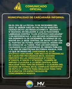 En un fallo sin precedentes para la región, la Municipalidad de Carcarañá aplicó severas sanciones legales y económicas al Club Atlético Carcarañá tras los graves incidentes registrados el pasado domingo 14 de diciembre. Las medidas, que buscan sentar un precedente sobre la «Pirotecnia Cero» y el respeto a la comunidad, incluyen una multa millonaria y la inhabilitación de todas sus dependencias.
