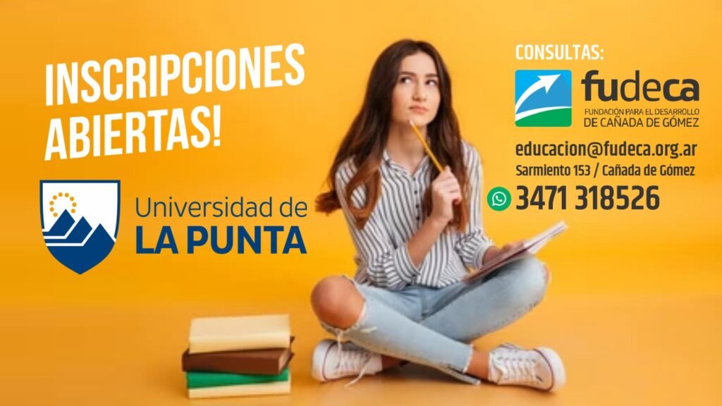 La Fundación para el Desarrollo de Cañada de Gómez informa que está abierta la inscripción a carreras virtuales de la Universidad de la Punta, para el ciclo lectivo 2026 en las tecnicaturas de: Finanzas, Comunicación y Medios, Publicidad, Producción y Realización Audiovisual, Diseño Digital y Videojuegos, Desarrollo de Software y Diplomatura en Gestión y Producción en Redes Sociales.