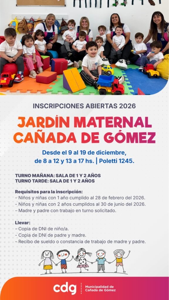La Municipalidad informa que del 9 al 19 de diciembre se encontrarán abiertas las inscripciones para el ciclo lectivo 2026 del Jardín Maternal Municipal, ubicado en Poletti 1245. La atención será de 8 a 12 y de 13 a 17 hs.