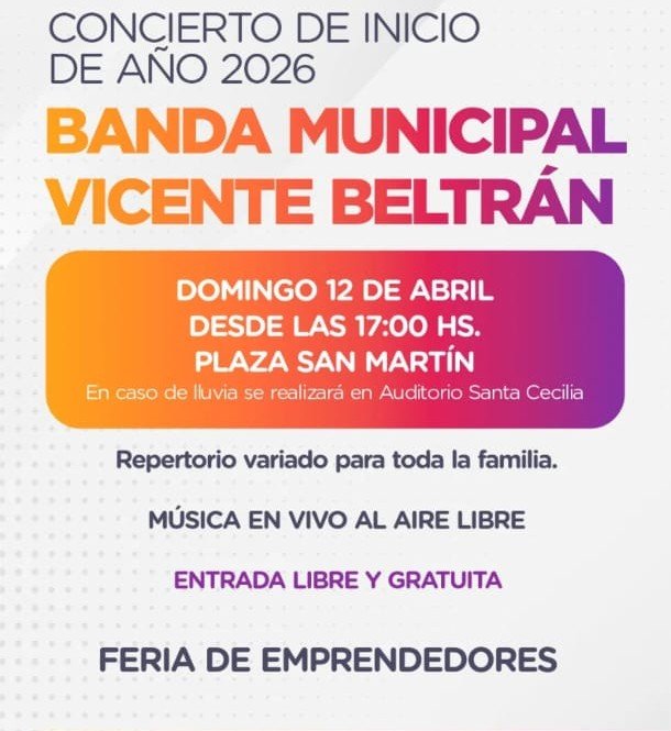 El domingo 12 de abril a partir de las 17 hs, la Banda Municipal «Vicente Beltrán» realizará su concierto de inicio de año en la Plaza San Martín, marcando el comienzo de una agenda cargada para este 2026.