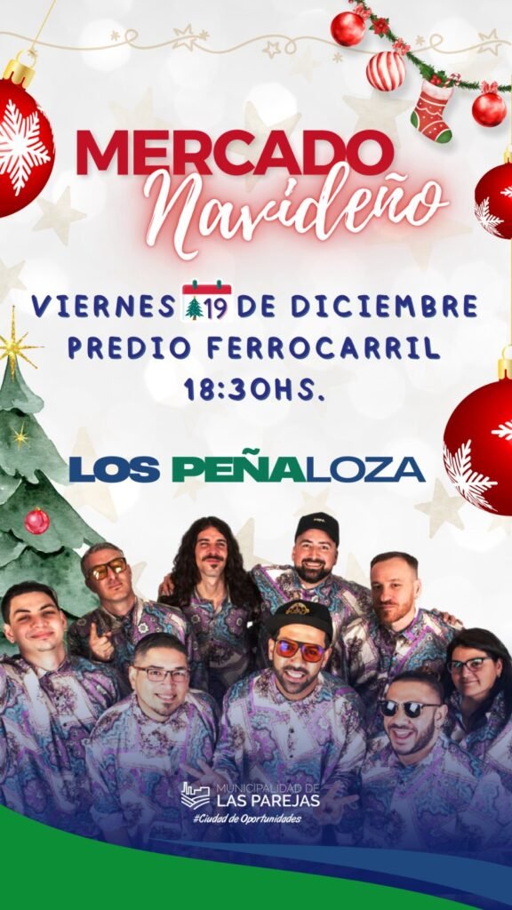 El viernes 19 , la ciudad de Las Parejas se vestirá de fiesta para recibir una nueva edición del Mercado Navideño. El evento tendrá lugar en el predio del ferrocarril a partir de las 18:30 hs.