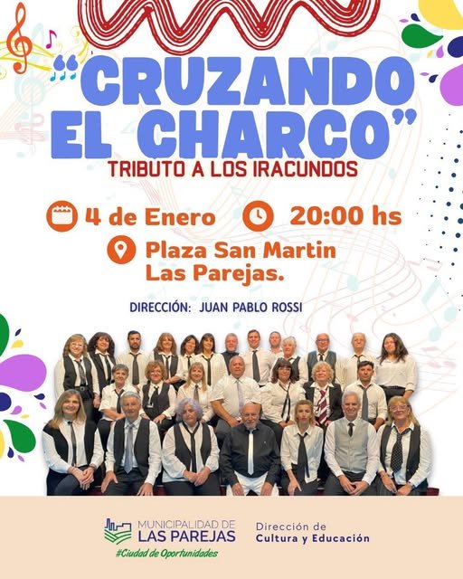 El sábado 4 de enero a partir de las 20 hs en Plaza San Martín el Taller de Canto e Interpretación de la Casa de la Cultura de Las Parejas presentará el espectáculo “Cruzando el Charco”, un tributo a Los Iracundos.