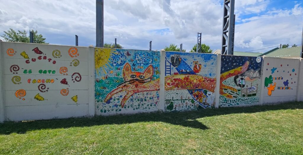 El mural surgió a partir del cuento “El gato Pancho”, una historia ideada por los chicos de las salas de 4, que sirvió como punto de partida para integrar lectura, escritura y conciencia ambiental.
