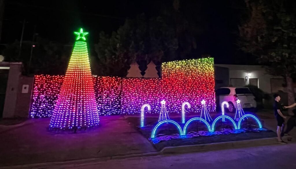 “Tenemos más de 10.000 focos funcionando en este momento. Nos capacitamos durante todo el año con gente de Estados Unidos, que allá son los grandes shows de Navidad en todas las casas; estuvimos todo el año armándolo, diseñando cada objeto en particular. Es todo diseño nuestro: los bastones de caramelo, los arbolitos, los arcos, todo es hecho por nosotros”.