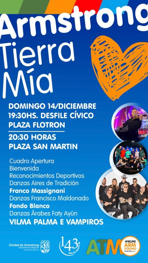La vecina localidad de Armstrong festejara su 143° aniversario como ciudad el sábado 13 y domingo 14 en Plaza San Martin con una nueva edición de Fiesta Tierra Mía.