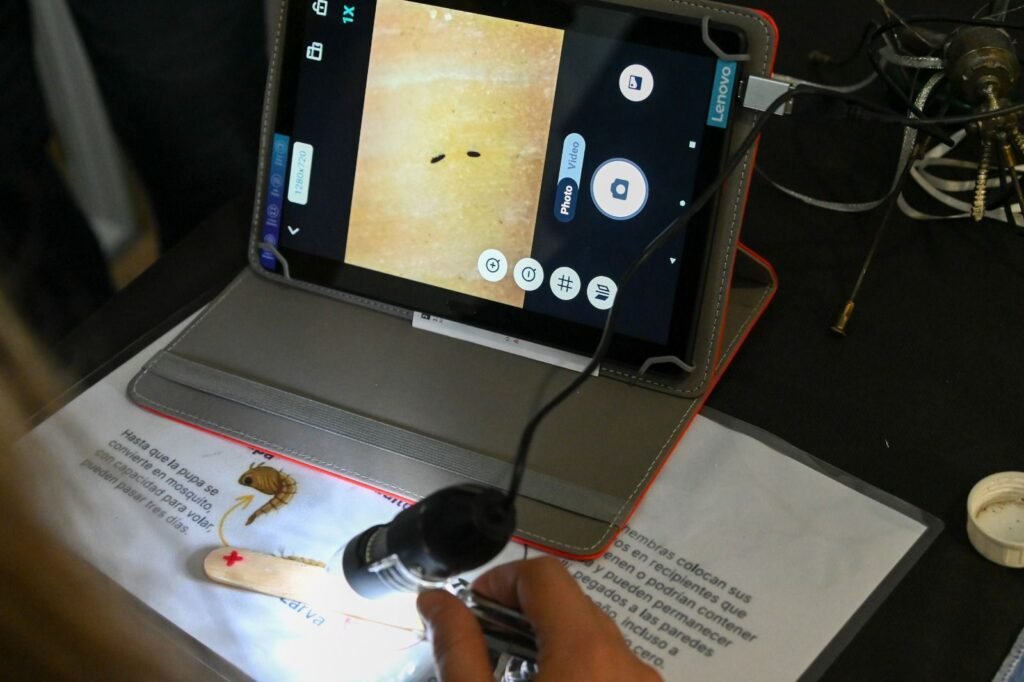 Las ovitrampas son pequeños recipientes de plástico de colores oscuros, en donde se pone agua y se le añade un bajalenguas, en los que la hembra del mosquito pondrá los huevos. “El Aedes aegypti tiene un ciclo de cuatro fases: huevo, larva, pupa y adulto. La hembra, que puede vivir hasta un mes, tiene capacidad para colocar hasta 200 huevos en una ovipostura, cada cinco días”, precisó Chumpitaz. Teniendo en cuenta ese ciclo, cada ovitrampa se observa semanalmente siguiendo un protocolo. Los equipos cuentan con 20 microscopios digitales portátiles, distribuidos estratégicamente en las localidades que participan, que permiten identificar los huevos de Aedes aegypti y cargarlos de manera inmediata en una aplicación. Además, recibieron una capacitación de David Gorla, doctor en Ciencias Biológicas, entomólogo e investigador superior del Conicet.