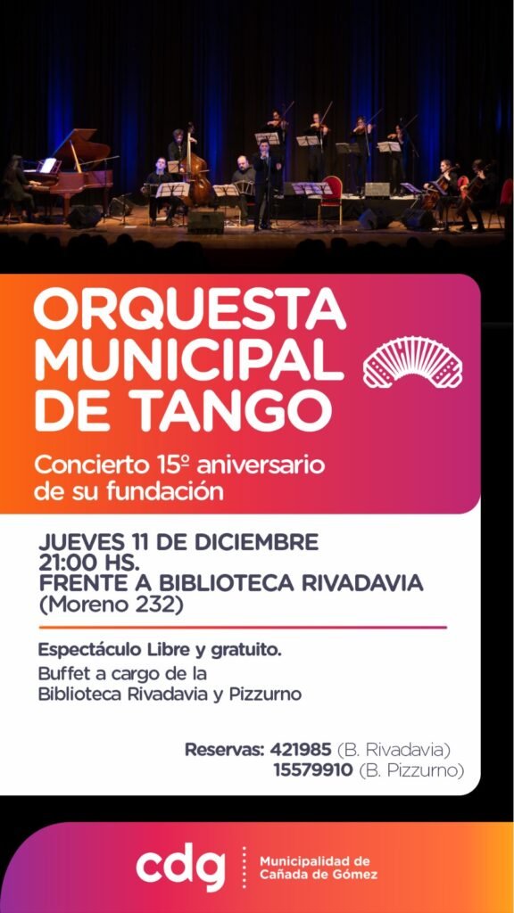 La Orquesta Municipal de Tango brindará un show único frente a la Biblioteca Rivadavia, por calle Moreno, donde festejará su 15° aniversario colaborando con las Bibliotecas Pizzurno y Rivadavia.