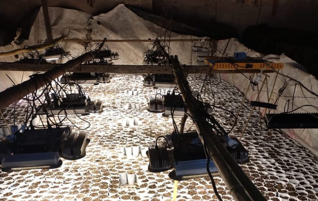 En el rastrillaje, los agentes hallaron indicios de una cuarta persona y dieron con un galpón cercano. Allí descubrieron un invernadero con casi 3.000 plantines de marihuana, frascos con la misma sustancia, más de 100 gramos de semillas en distintos recipientes, 32 reflectores y otros elementos de interés para la causa.