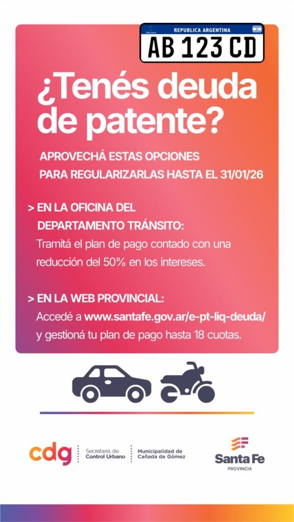 Desde el municipio informan que se encuentran disponibles las opciones para regularizar deudas de patente, con vigencia hasta el 31 de enero de 2026.