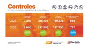 Además, durante el trimestre se fiscalizaron 227.556 vehículos, lo que representa un incremento del 4,3 % respecto a 2025, cuando se habían controlado 218.125. En ese marco, se labraron 28.245 actas de infracción por distintas faltas y se retuvieron 868 vehículos, por encima de los 690 registrados en el mismo período del año pasado.