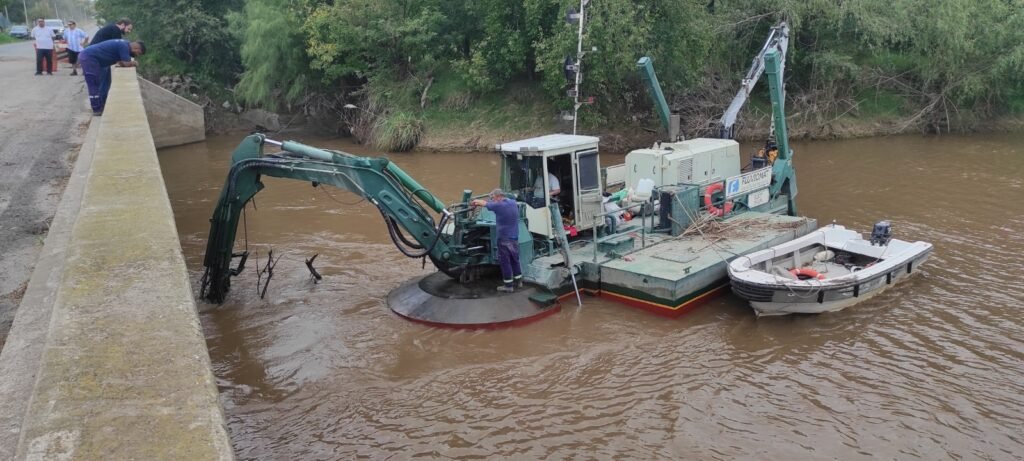 Días atrás la draga finalizó el retiro de ramas y residuos de las pilas del puente y sus estribos. Dada la actual crecida se debieron posponer hasta el descenso del río las tareas de dragado de embanques en el cauce. No obstante, la limpieza concretada facilitó el actual escurrimiento. Igualmente, los nuevos restos de ramas y árboles atascados por la corriente serán retirados cuando se retomen los trabajos