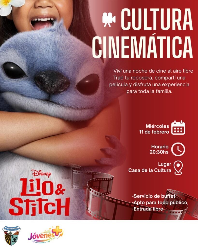 La actividad consiste en una función de cine al aire libre, pensada para compartir en familia o con amigos, y se llevará a cabo este miércoles 11, a partir de las 20:30 horas, en la Casa de la Cultura, donde se proyectará Lilo & Stich.